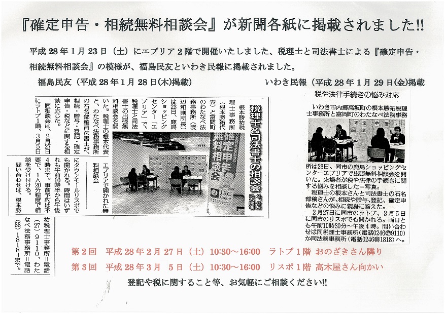『確定申告・相続無料相談会』が新聞各社に掲載されました!!