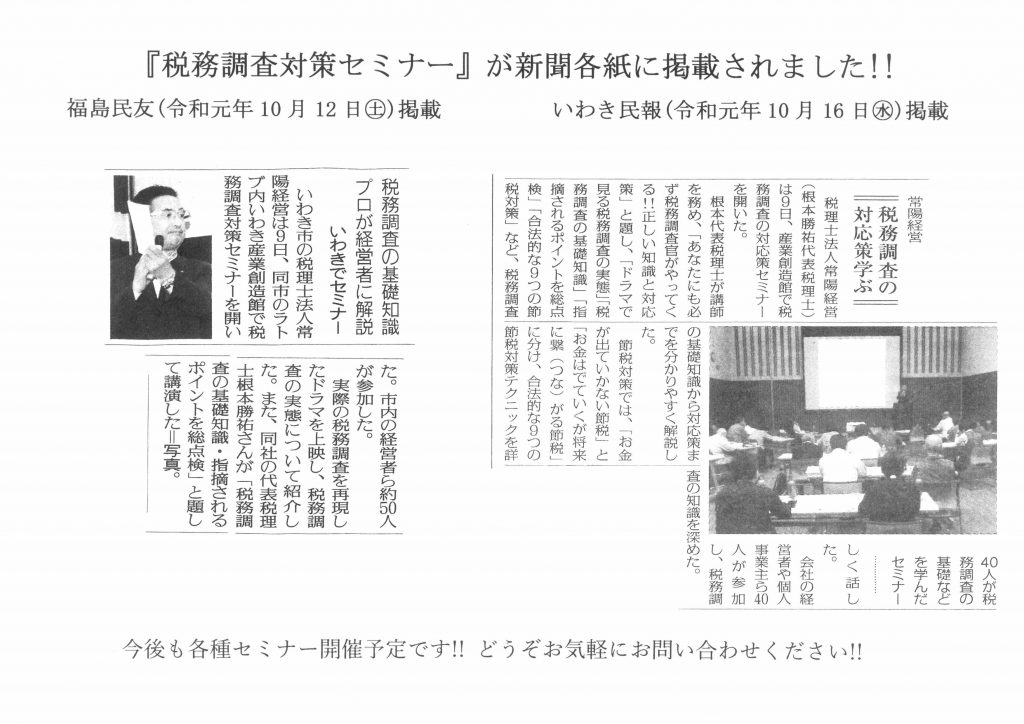 『税務調査対策セミナー』が新聞各紙に掲載されました!!