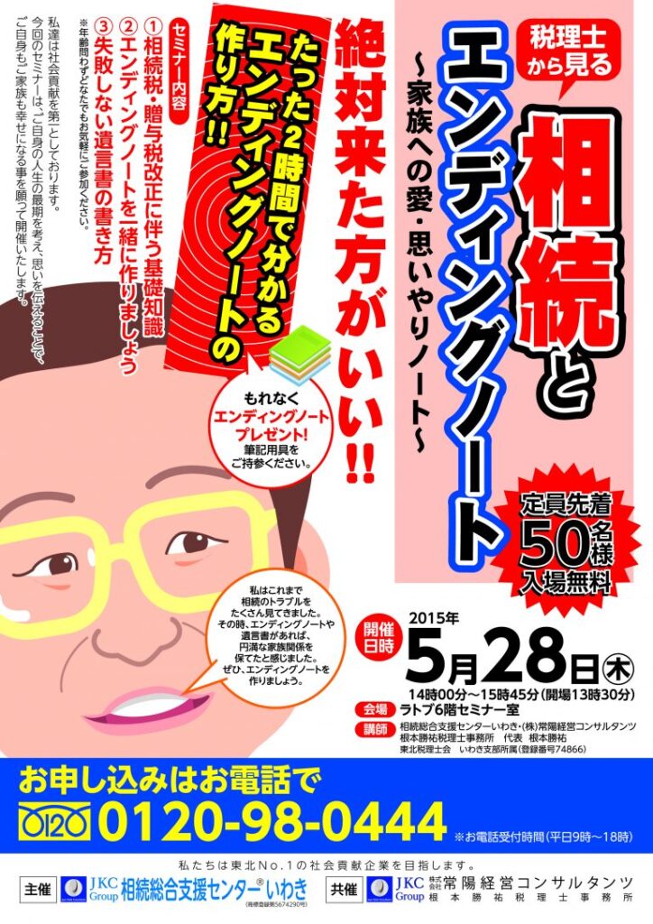 5月28日(木)午後2時~3時45分、ラトブ6階セミナー室で開催いたします、『相続とエンディングノート』セミナーは、お蔭様で満席定員となりました!!